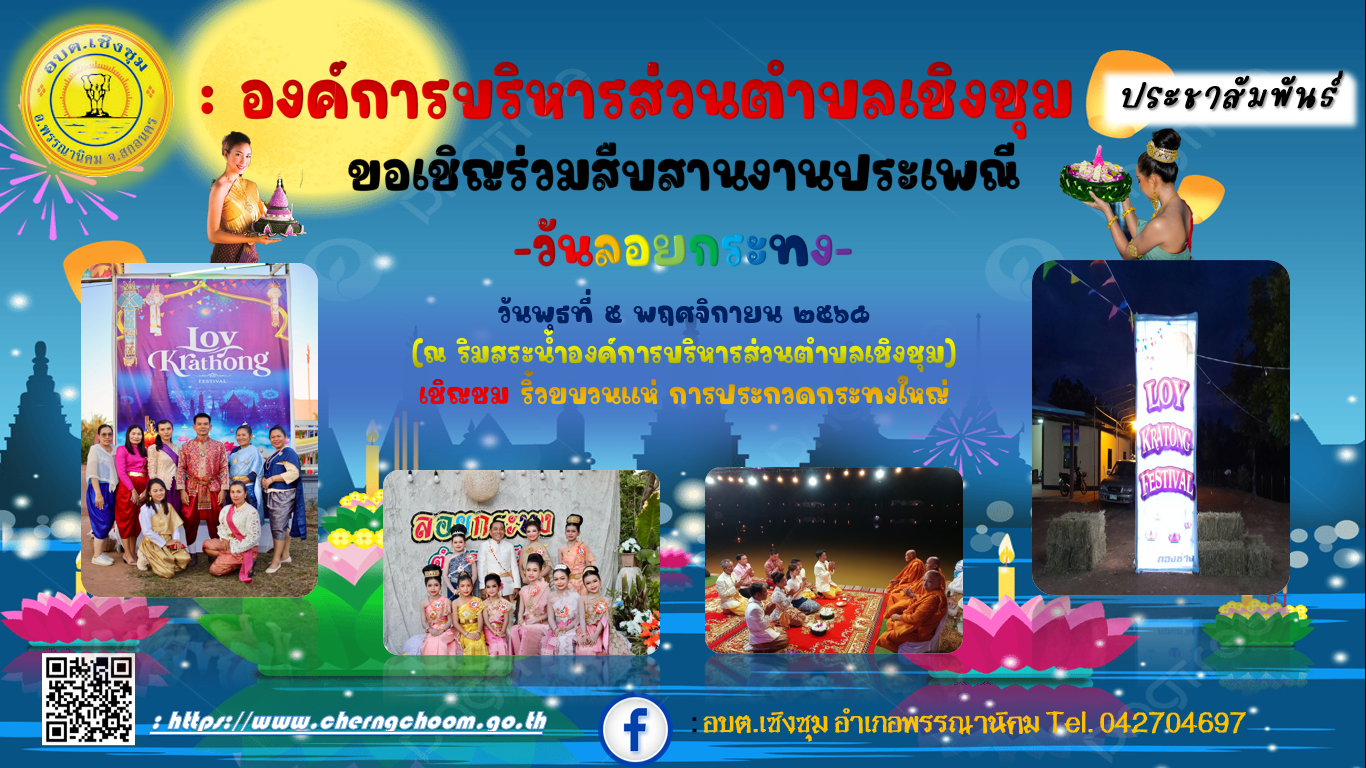 วันพุธที่ ๕ พฤศจิกายน ๒๕๖๘ (ณ ริมสระน้ำองค์การบริหารส่วนตำบลเชิงชุม) เชิญชม ริ้วขบวนแห่ การประกวดกระทงใหญ่
